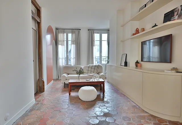 Très bel appartement entièrement réaménagé avec de belles tomettes. Nous avons réalisé la rénovation complète de cet appartement, en passant par les peintures, les menuiseries sur-mesure, les niches, la cuisine, salle de bain ou encore la chambre. Les arches et courbes rendent cet appartement chaleureux et agréable à vivre. Conception : Sophie Saint-André