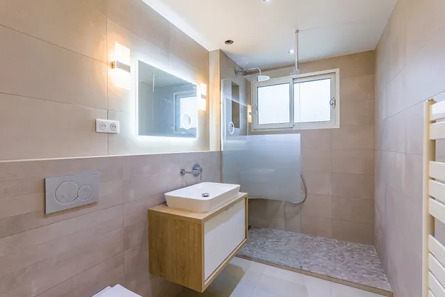 Nous avons réalisé une rénovation totale de cet espace de 45 m², en repensant chaque détail pour offrir un résultat moderne et fonctionnel. Au programme : chape légère, remplacement des fenêtres, refonte complète de la plomberie et de l’électricité, pose de carrelage, menuiserie sur mesure, et bien plus encore. Chaque élément a été soigneusement sélectionné et installé pour répondre aux besoins spécifiques du client, alliant confort, esthétique et performance. Conception : IH Studio