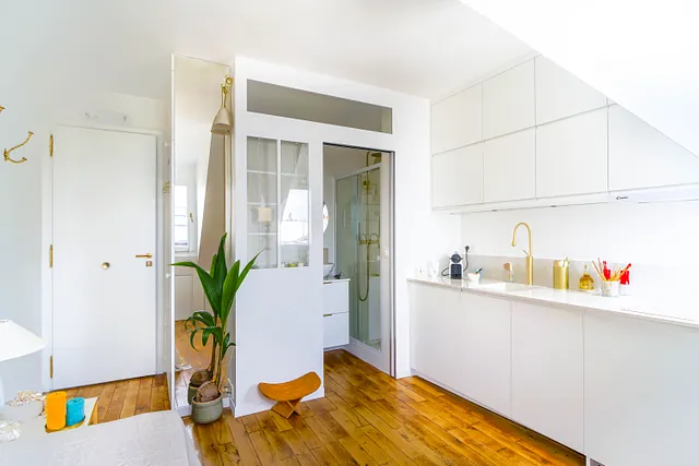 Ce studio repensé et réaménagé par les architectes, offre de beaux volumes bien pensés et très ergonomiques. Initialement, un rideau séparait la douche et les toilettes du reste de l'appartement. Nous avons donc montés des cloisons pour créer une vraie salle d'eau, laisser des ouvertures pour mettre en place des verrières (fixes et coulissantes, faites dans notre atelier) afin de faire entrer la lumière dans cette pièce. Côté menuiserie, nous avons réalisés le dressing d'entrée, les meubles et portes de cuisines, les placards sous pente, ainsi qu'un sommier dépliable sur-mesure.