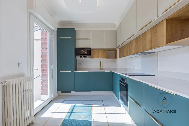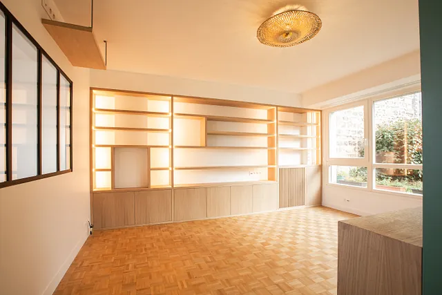 Nous venons d’achever la rénovation intégrale d’un bel appartement de 120 m² situé dans le 16e arrondissement de Paris. Toutes les menuiseries ont été réalisées dans notre atelier de Massy (91), incluant une cuisine sur mesure, des placards intégrés et une bibliothèque pensée pour s’adapter parfaitement aux volumes et au style de l’appartement. Un projet sur mesure, du gros œuvre aux finitions, livré clé en main.