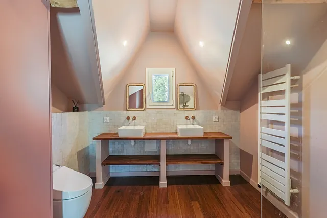 Cette jolie maison a nécessité 3 mois de travaux et la totalité de nos équipes. Les peintures et les sols ont été refait. Toute la partie bois : poutres, parquet et escalier a été poncé et vitrifié. La salle de bain de la suite parentale est maintenant recouverte de jolis carreaux marbrés. Nous sommes très fiers d’avoir réalisé ce très grand claustra en métal sur-mesure.