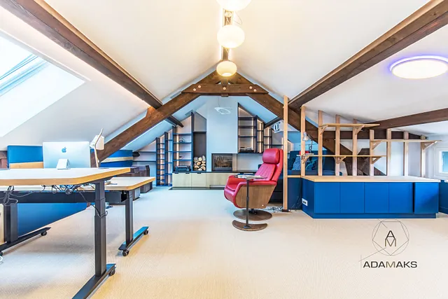 Ce projet a consisté à transformer entièrement un grenier en un véritable espace de vie hybride, à la fois lieu de détente, de travail et de projection, parfaitement intégré sous les toits. Un lieu entièrement personnalisé, conçu pour allier confort, design et innovation. Conception : Carré Plié