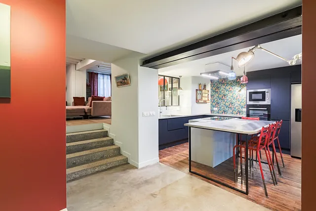 Sur la partie haute, l'ouverture du mur porteur apporte une grande pièce de vie, avec cette cuisine ouverte sur le salon.