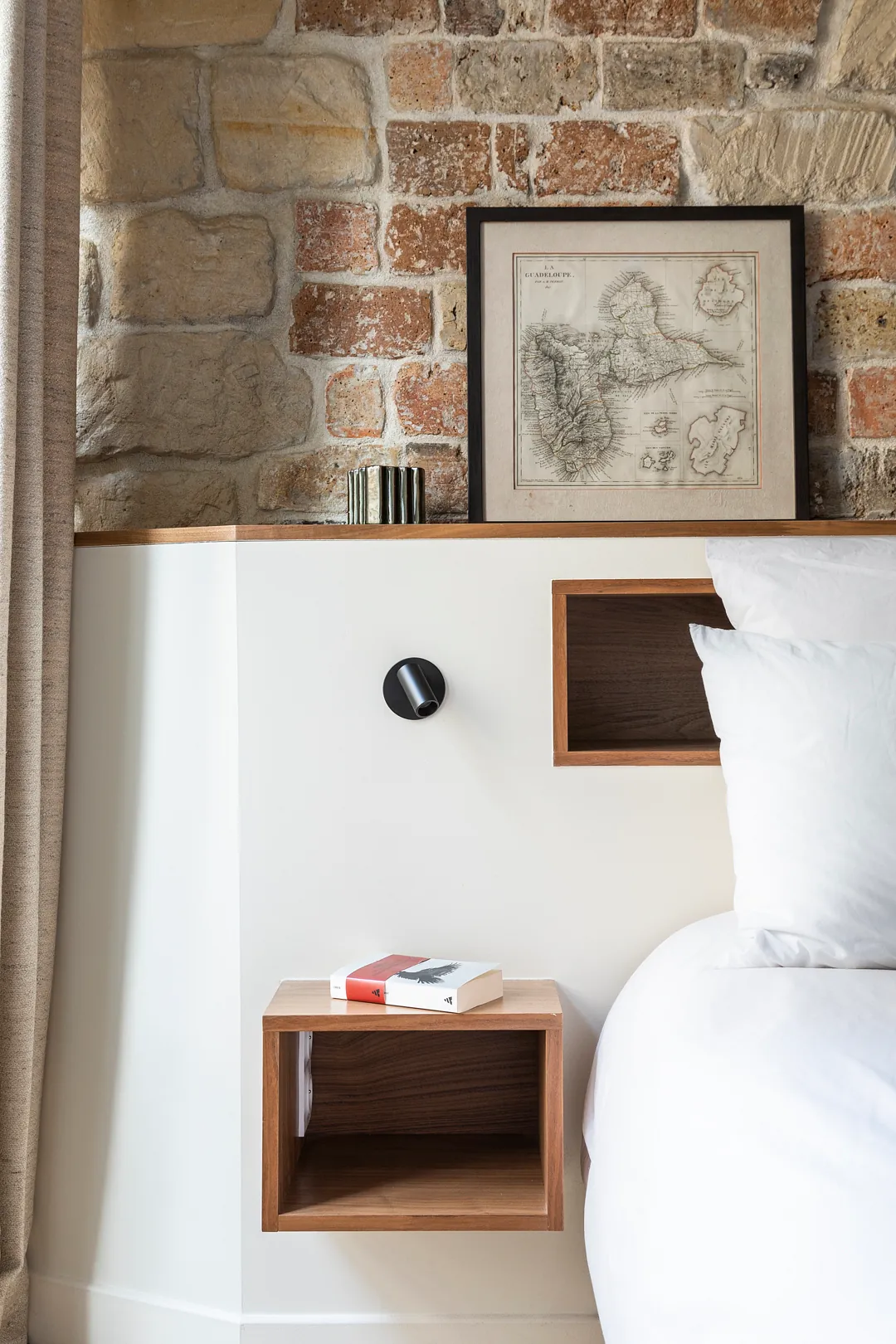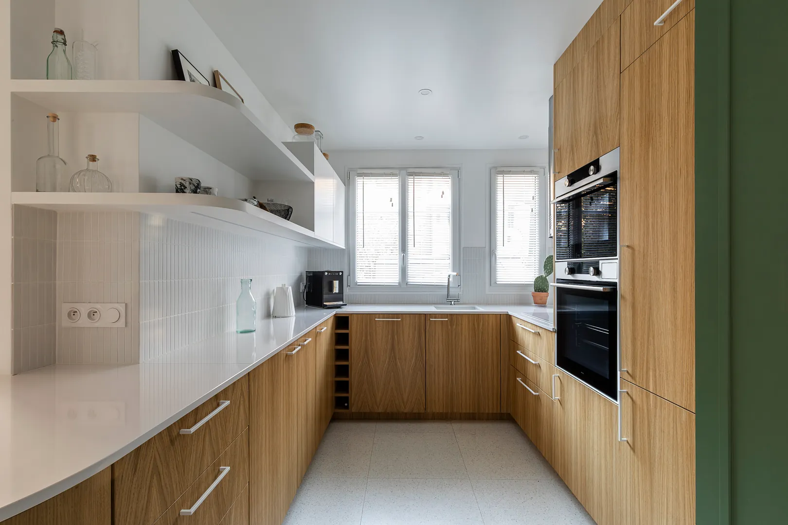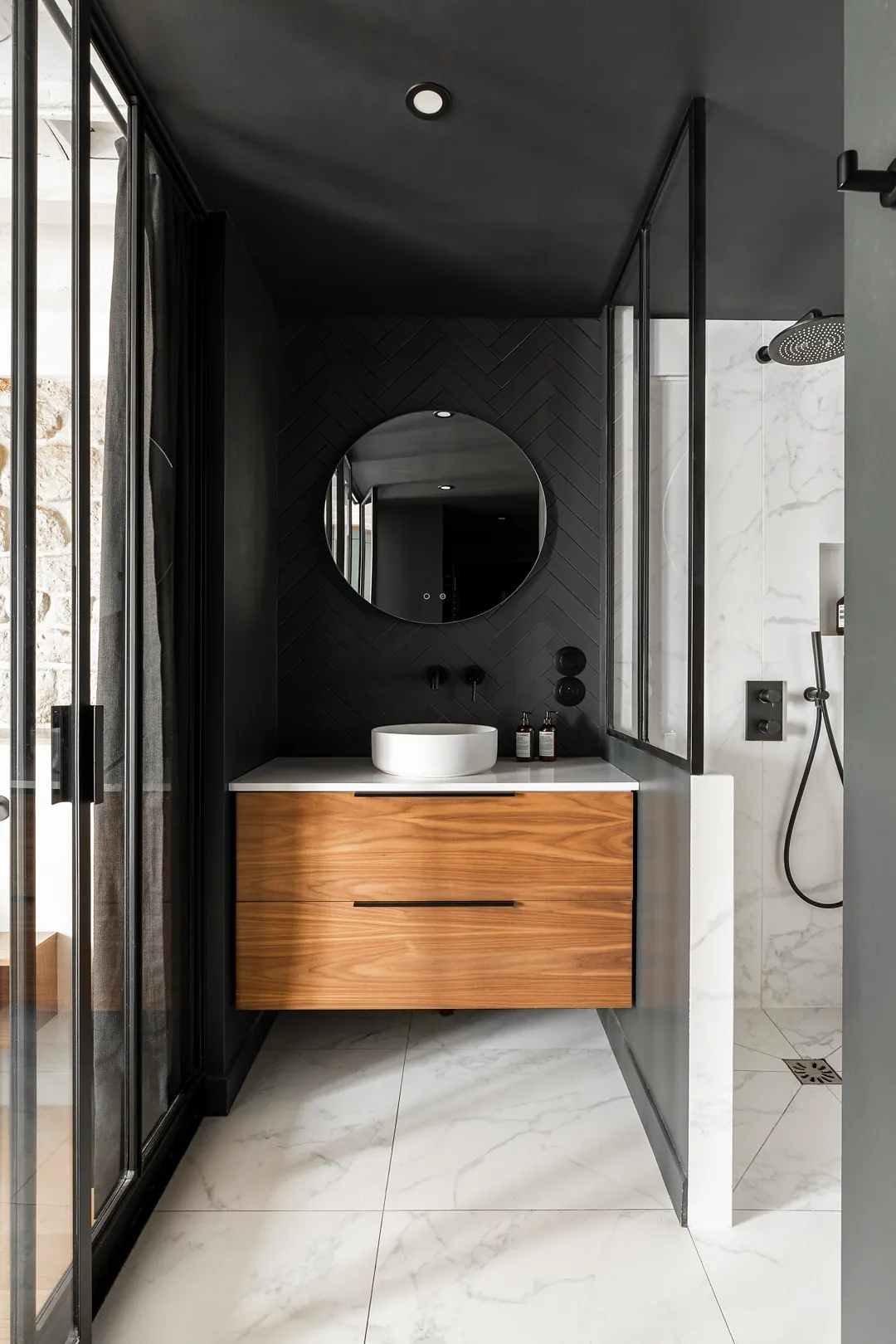 Nous avons transformé l’ancien cabinet en chambre et conçu la salle de bain comme un sas graphique entre les espaces. L’appartement a été entièrement ouvert pour offrir un vaste lieu de vie chaleureux et lumineux. Nous avons travaillé des formes arrondies pour une circulation fluide, et sélectionné des matériaux nobles : murs en pierre, poutres apparentes, bois clairs, terrazzo, quartz et marbre. Conception : Estelle Chevallier