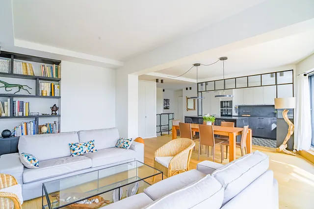 Sur la partie haute, l'ouverture du mur porteur apporte une grande pièce de vie, avec cette cuisine ouverte sur le salon.