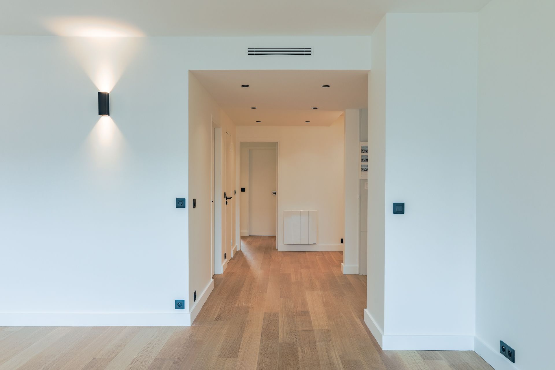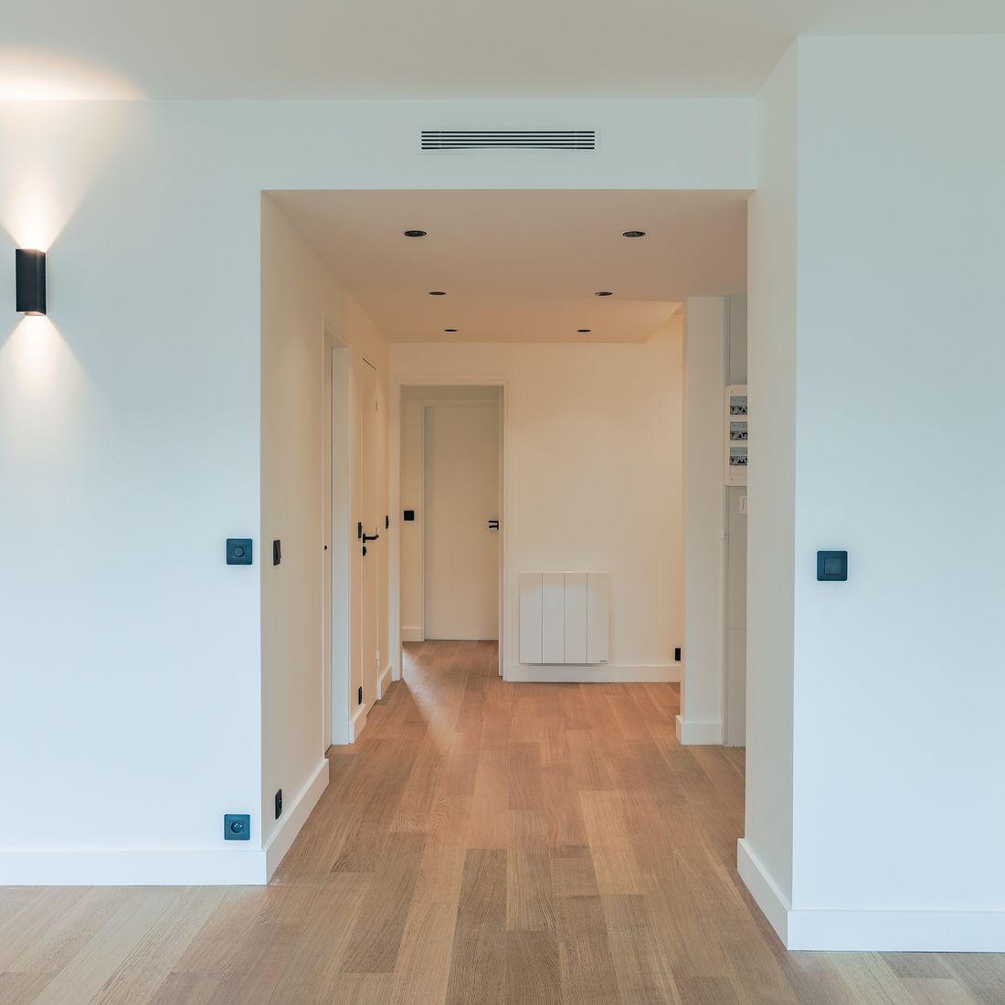 Dans cet appartement, nous nous sommes chargés de la totalité de la rénovation : démolition, électricité, plomberie, changement des fenêtres, peinture et pose des sols et luminaires. Le résultat est doux, et très épurée.